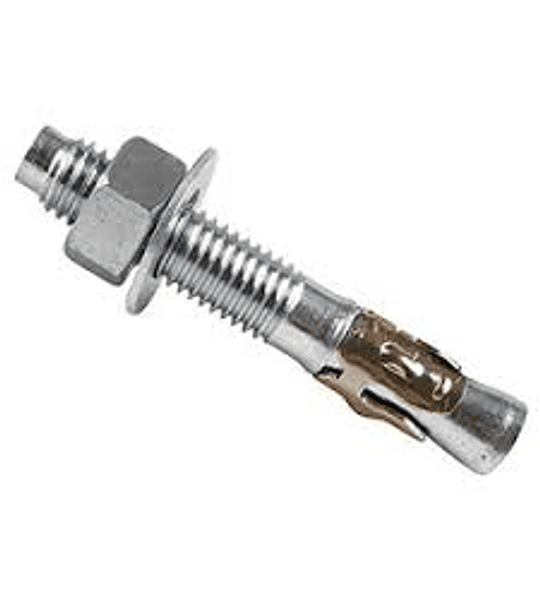 Perno de anclaje con cuña de 1/2 pulgadas de diámetro y 5 1/2 pulgadas de largo, fabricado en un sólo cuerpo más 2 secciones (tuerca y clip), hecho en acero zincado resistente.